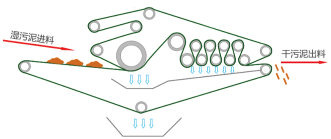 工作原理:通過對含水率80%左右的污泥進行化學(xué)調(diào)質(zhì)改性處理后再高壓擠壓脫水至含水率60%以下,KTSD壓濾脫水機是由上下兩條張緊的濾帶夾帶著污泥層,從一連串有規(guī)律排列的輥壓筒中呈S型經(jīng)過依靠濾帶本身的張力形成對污泥的擠壓和剪切力,把污泥層中的毛細水?dāng)D壓出來,獲得含固率較高的泥餅,從而實現(xiàn)污泥的脫水。
